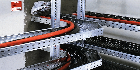 Auch Kabeltrassen müssen sich an veränderte Produktionslinien anpassen können: Sie benötigen ein flexibles System, dass sich leicht montieren und demontieren lässt. Sicher und schnell arbeiten Sie hier mit den Hilti Schienensystemen MQ und MT samt Zubehör und Dübeltechnik (z.B. HST3 oder HUS3) – einfach auszuwählen im Installations-Selektor. Ein zusätzlicher Faktor, den es bei Kabeltrassen zu berücksichtigen gilt, ist der Brandschutz. Weil Kabeltrassen häufig durch Wände hindurch verlegt werden müssen, muss eine sichere und zuverlässige Brandschutzabschottung vorhanden sein. So ist im Brandfall ein eindämmen des Feuers möglich. Entdecken Sie dazu unsere effektiven Brandschutzsysteme.