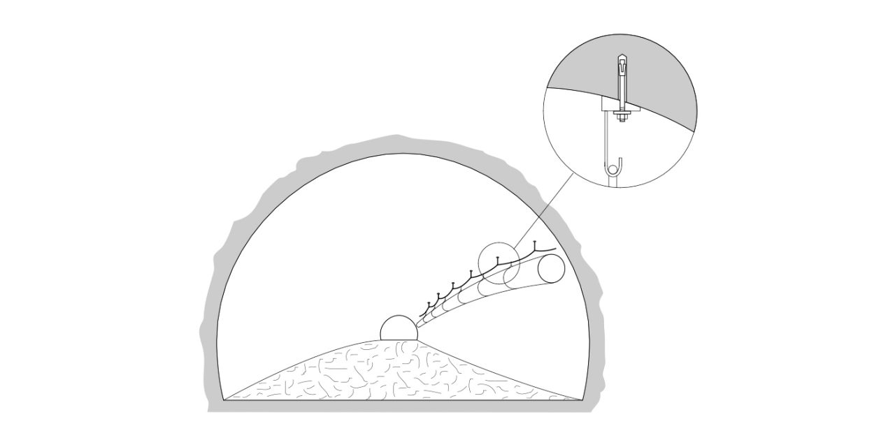 Während der Bau- und Sanierungsarbeiten im Tunnel muss eine ausreichende Belüftung gewährleistet sein, um das Gesundheitsrisiko durch Lufteinschlüsse oder Sauerstoffmangel zu verringern. Die Belüftung kann auch zur Kühlung der Tunnelumgebung verwendet werden. Die Lüftungskanäle (Kunststoffrohre) für die temporäre Lüftung während des Tunnelbaus werden normalerweise an einem Drahthaken an der Tunneldecke befestigt. Als vorübergehende Befestigung kann die Anforderungen an die Korrosionsbeständigkeit häufig vernachlässigt werden.