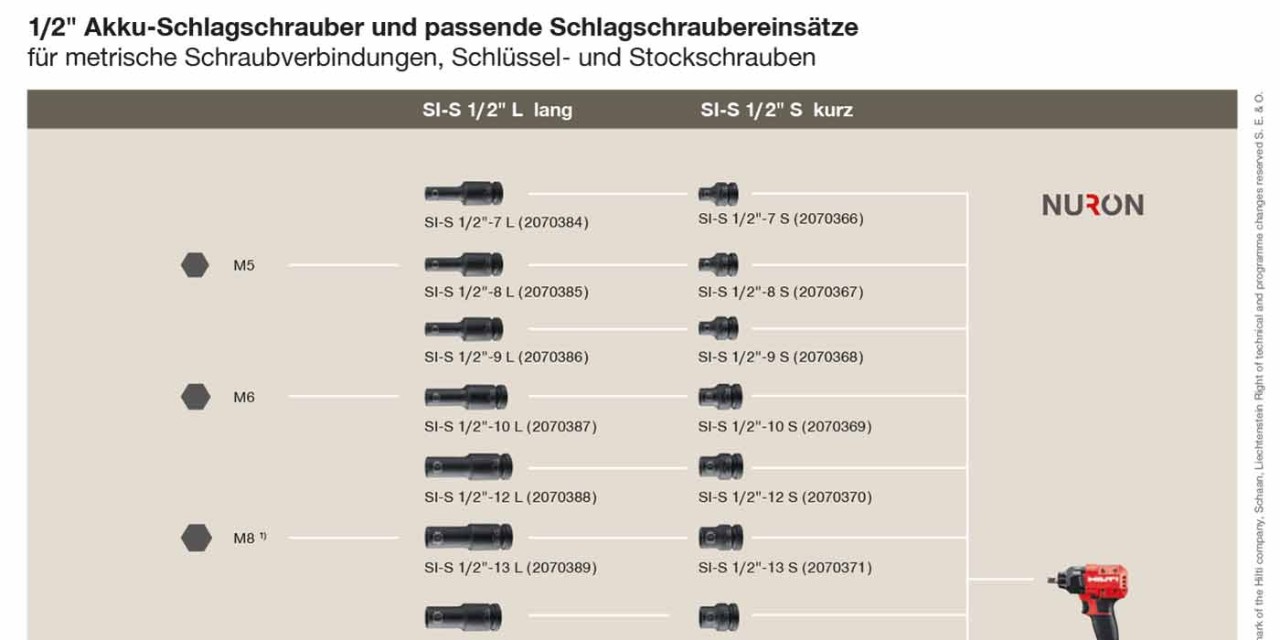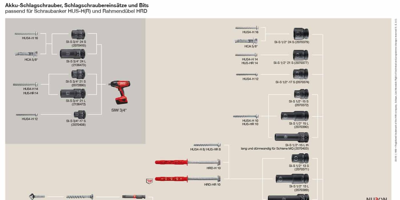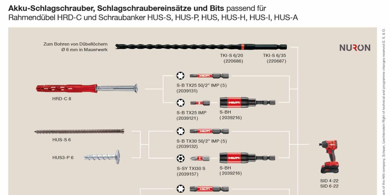 Akku-Schlagschrauber, Schlagschraubereinsätze und Bits passend für Rahmendübel HRD-C und Schraubanker HUS-S, HUS-P, HUS, HUS-H, HUS-I, HUS-A