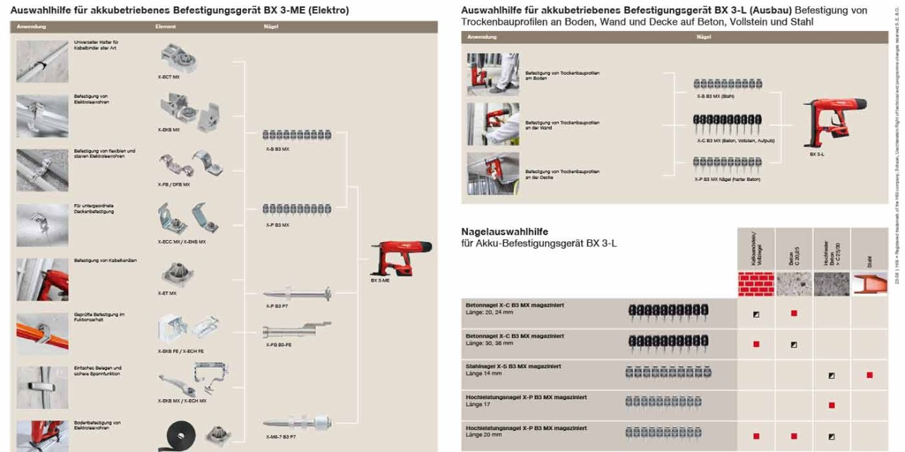 Akkubetriebenes Befestigungsgerät BX 3, Elemente, Nagelauswahlhilfe und Zubehör