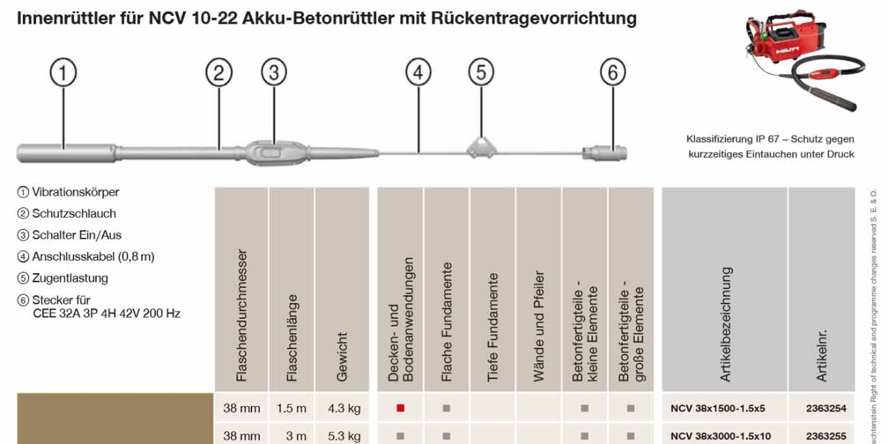 Innenrüttler für NCV 10-22 Akku-Betonrüttler mit Rückentragevorrichtung